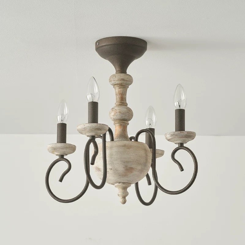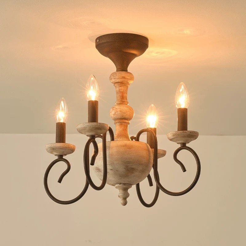 French Country Vintage Wooden Semi-Flush Mount Chandelier – 4-Light Rustic Ceiling Light for Bedroom & Dining Room