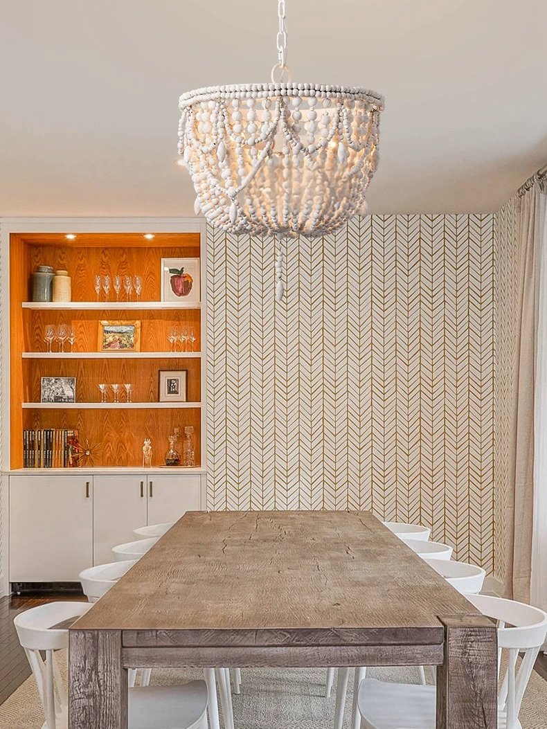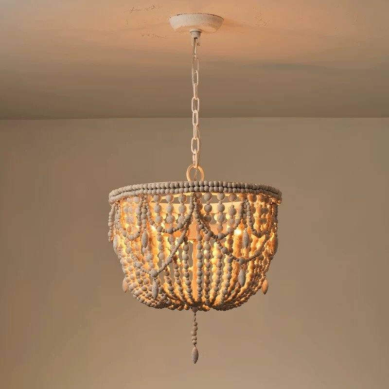 French Country Distressed White Wooden Bead Chandelier – Rustic Boho Lighting for Bedroom & Dining Room