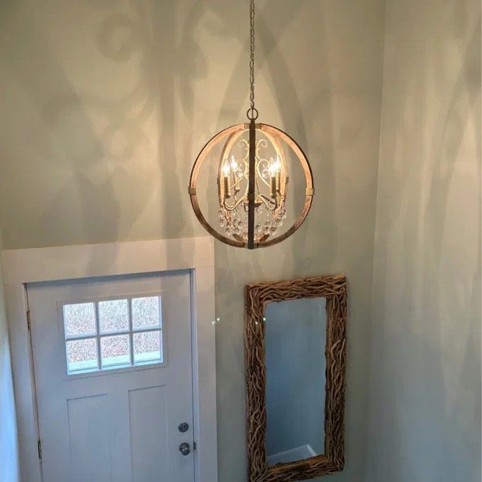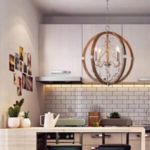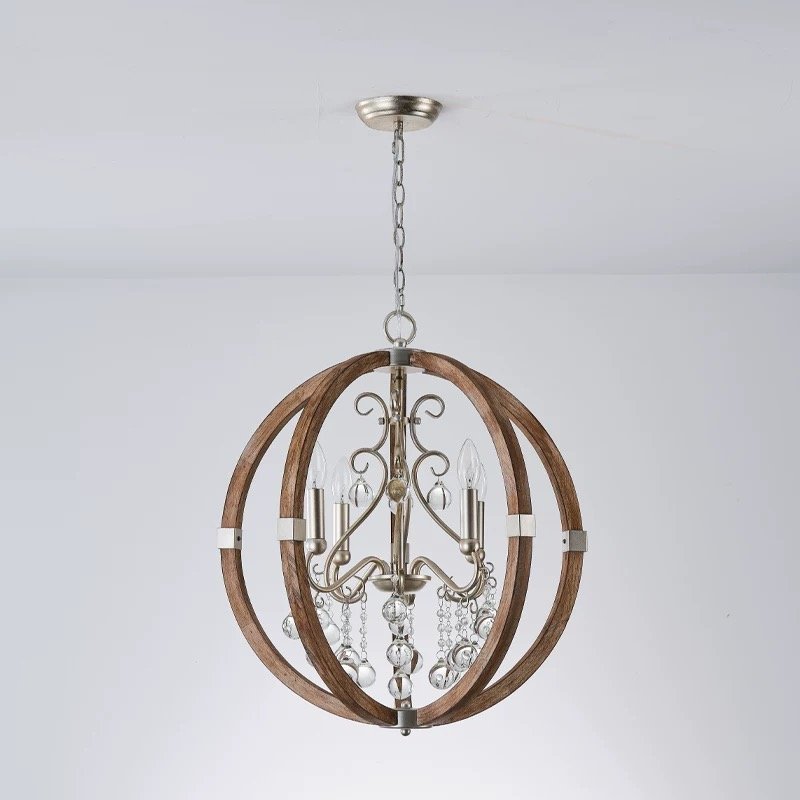 Crafted from natural distressed wood, ornate metal scrollwork, and sparkling crystal accents, this vintage globe chandelier brings warm farmhouse charm to your home.