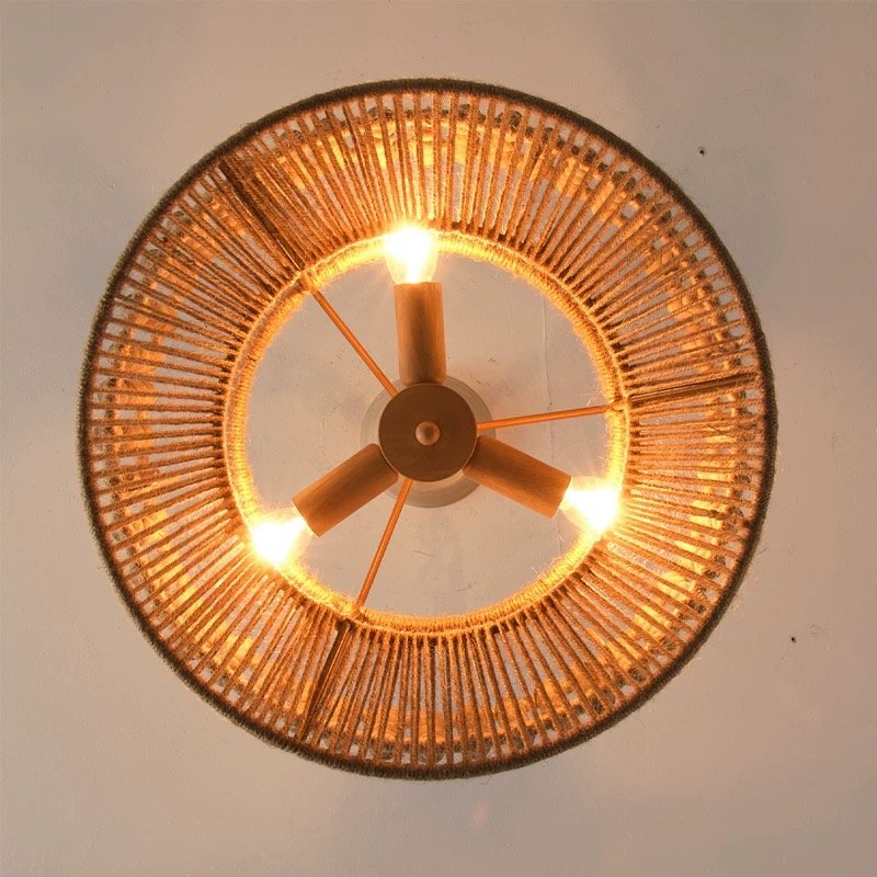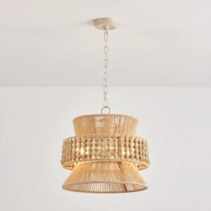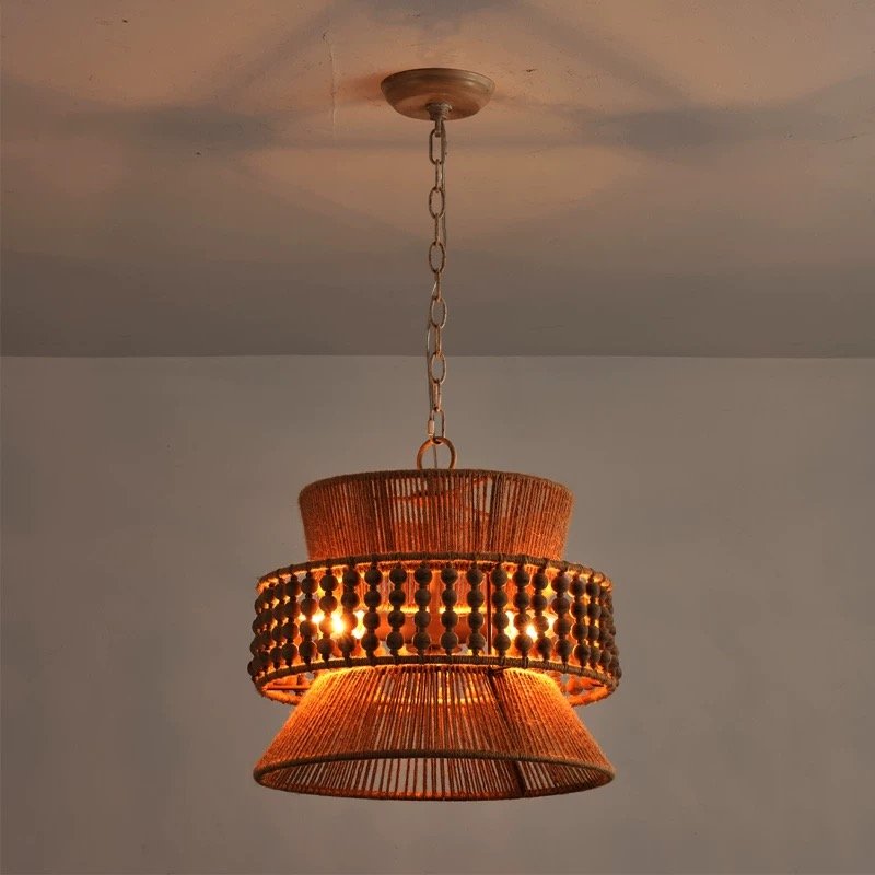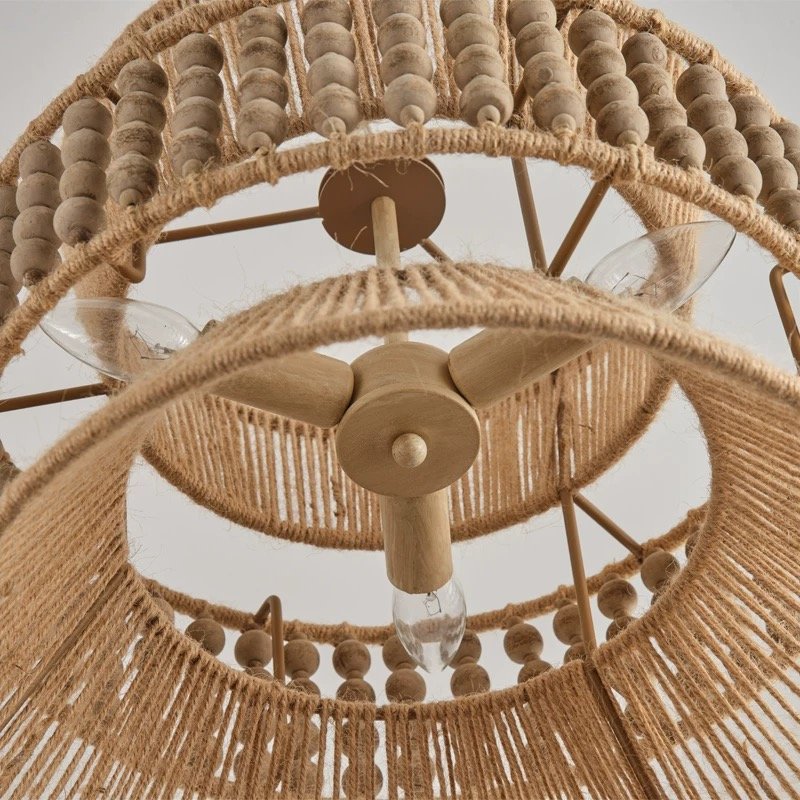 Boho Jute & Wood Bead Chandelier – Natural Rustic Pendant Light