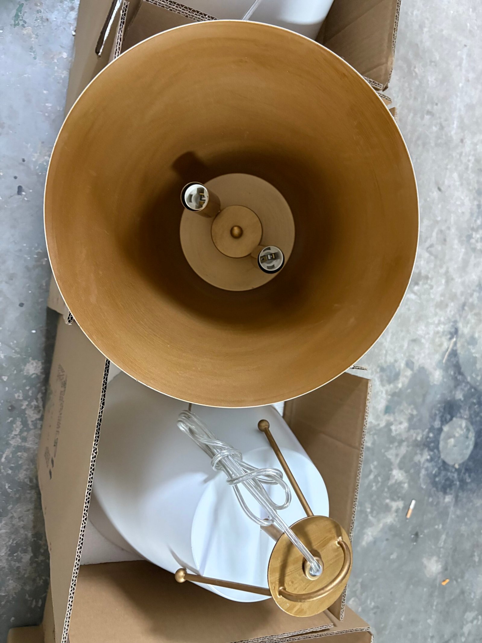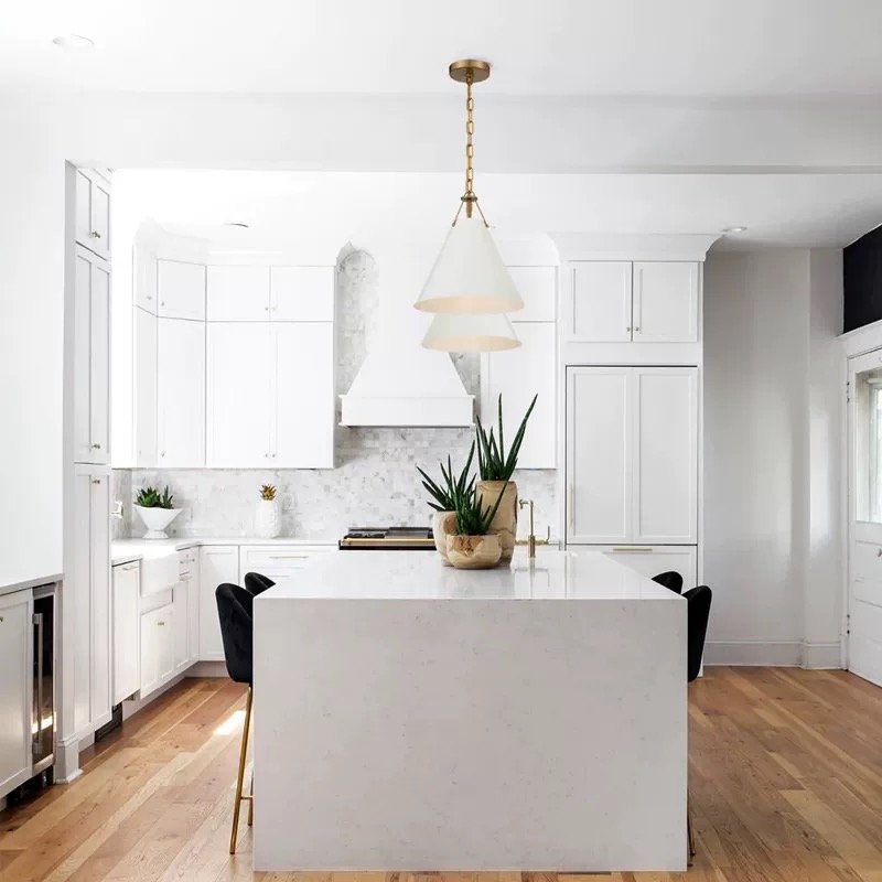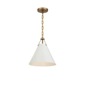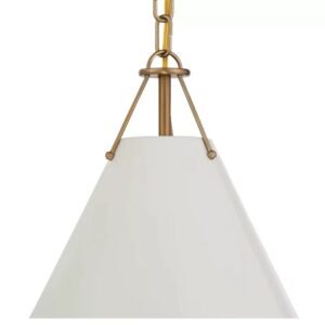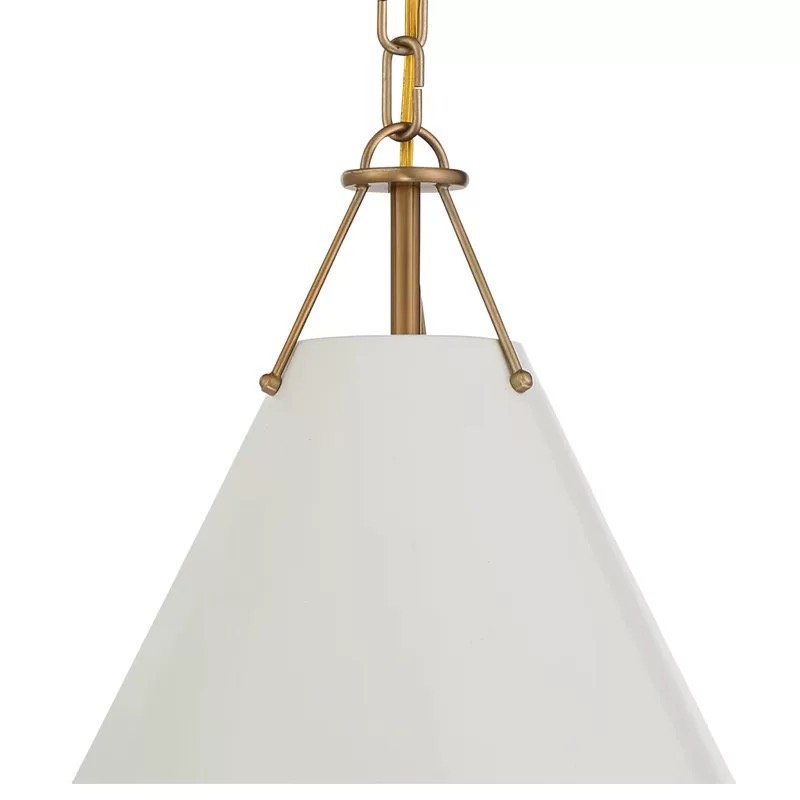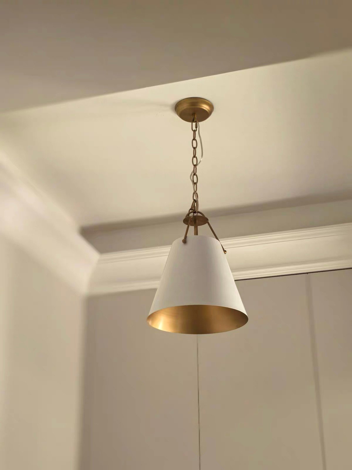 Versatile cone-shaped pendant light in white/black, available in 3 sizes. Features vintage brass chain and metal frame—perfect for kitchen islands, bedside, hallways, and rustic French country homes.