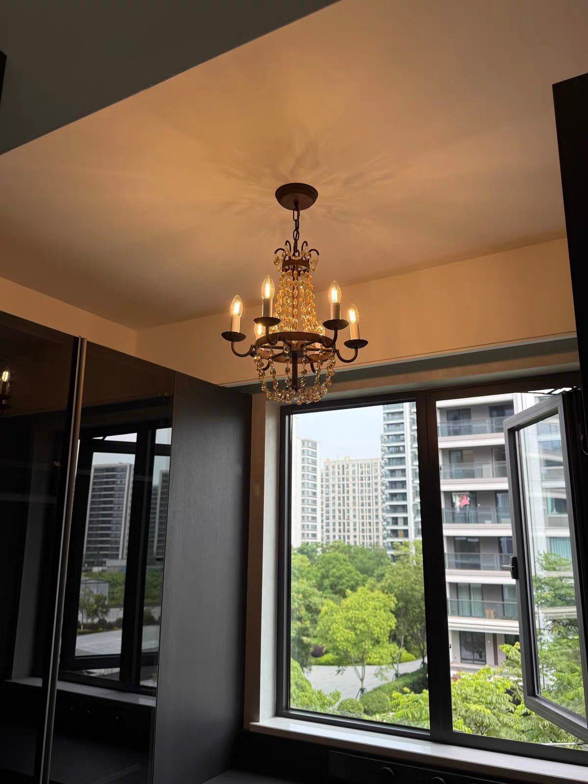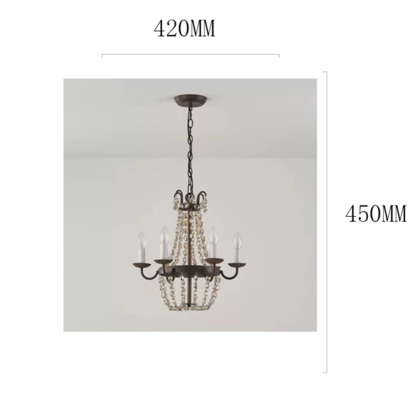 Material: Crystal+ iron Size(MM):D420*H450 Lamp Base: E14*6 Usage: Simple & Dry Indoor Areas Warranty: 5-Year Warranty Contact Us:+8615099891132